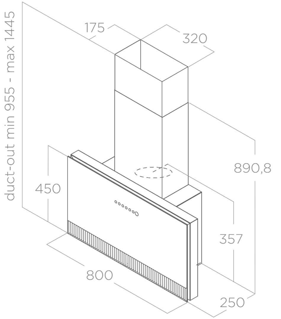 Уникальное сочетание форм и материалов позволяет легко адаптировать вытяжку к любому стилю интерьера, как в качестве отдельного элемента, так и встраивая ее в настенные шкафы. Модель доступна в версии с черным или серым стеклом в сочетании с элементами с эффектом чугуна, что придает изделию еще большую индивидуальность.