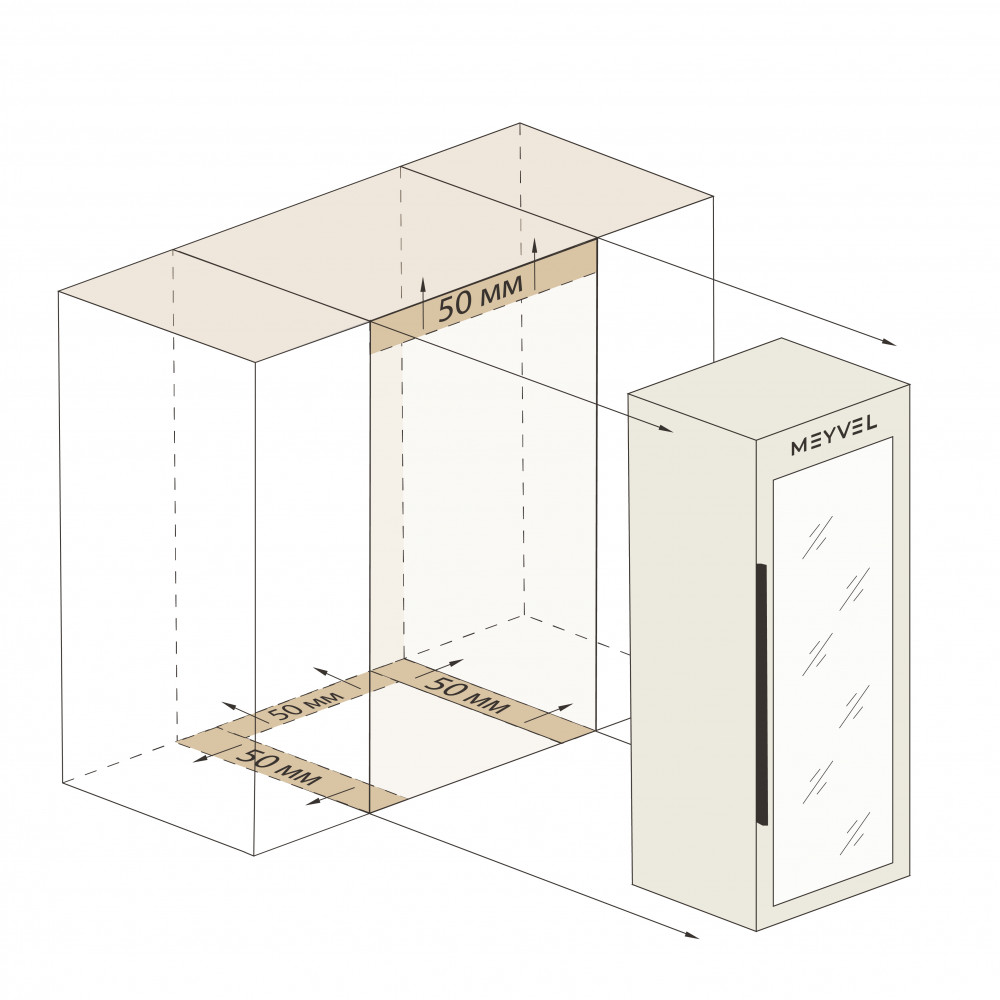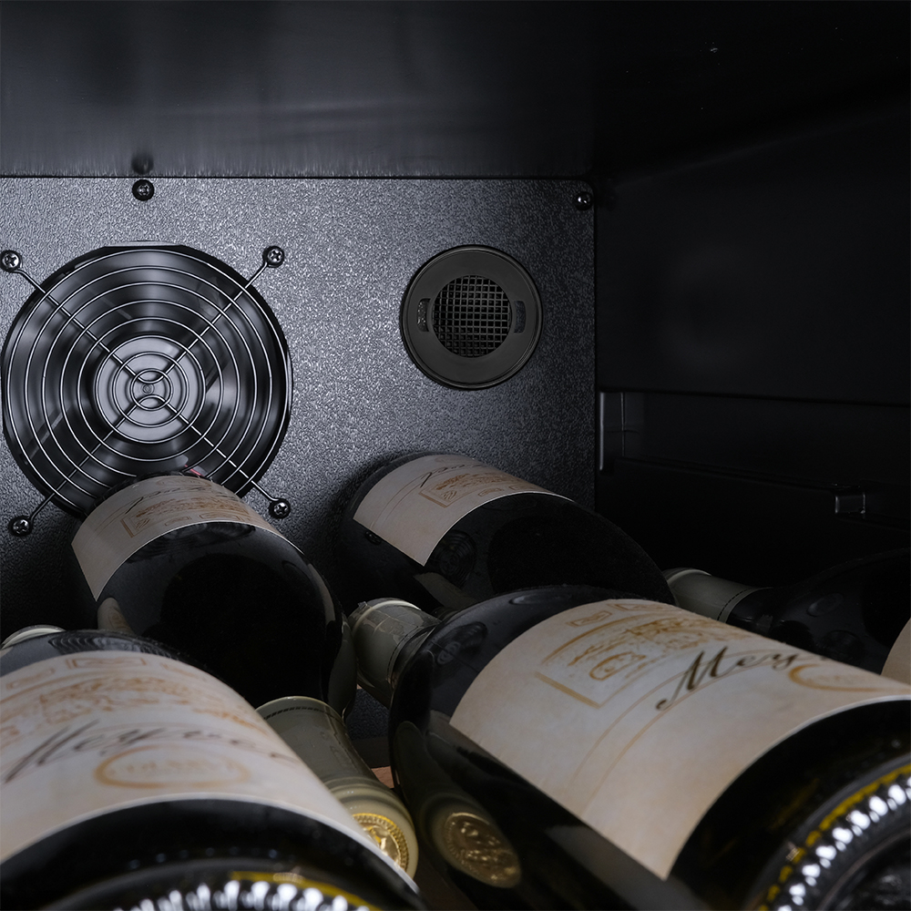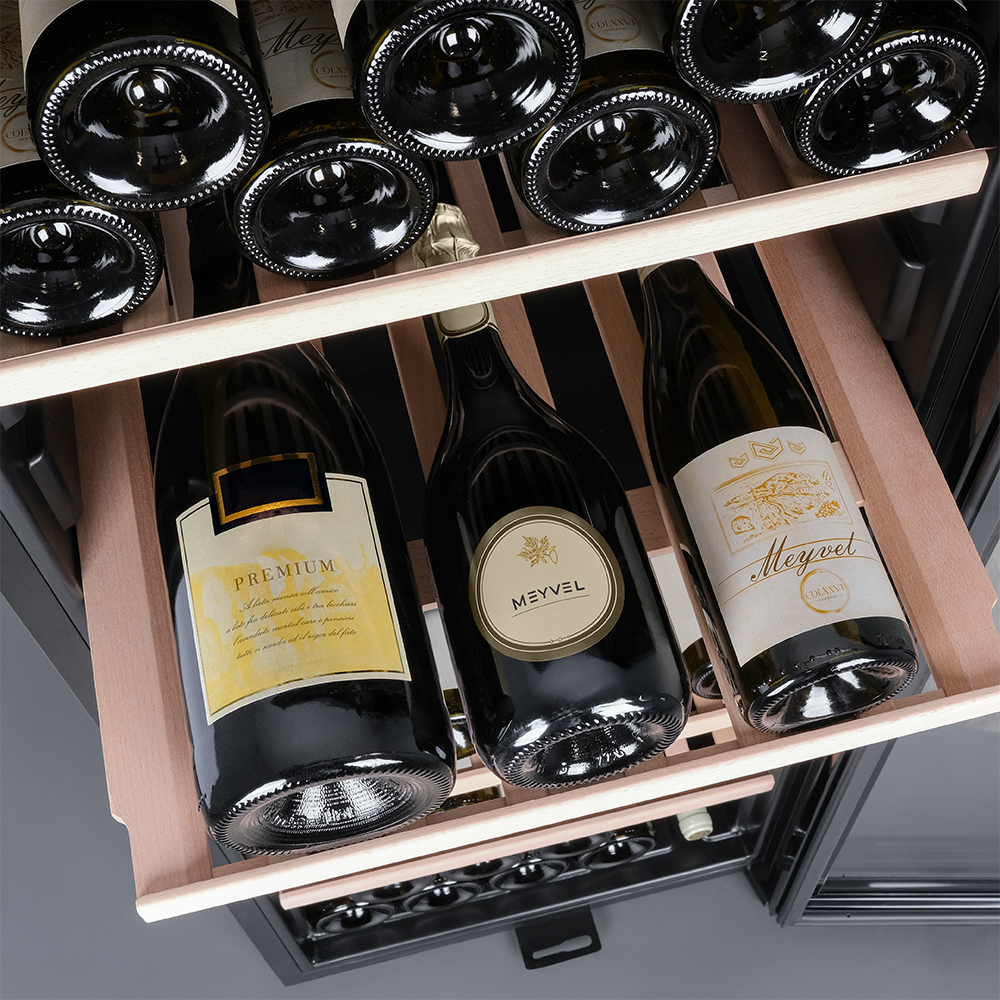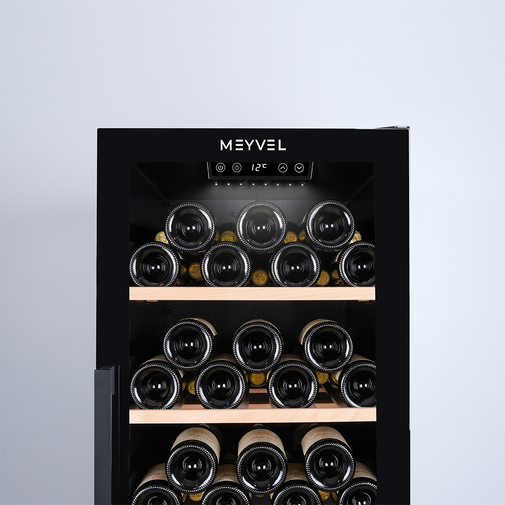 Meyvel MV105-KBF1 — отдельностоящее устройство, поэтому можно разместить его в любом удобном месте ресторана, отеля, бара или домашней винной комнаты без встраивания в мебель. Это удобно не только для создания стиля и атмосферы в интерьере, но и для предоставления легкого доступа к винам.