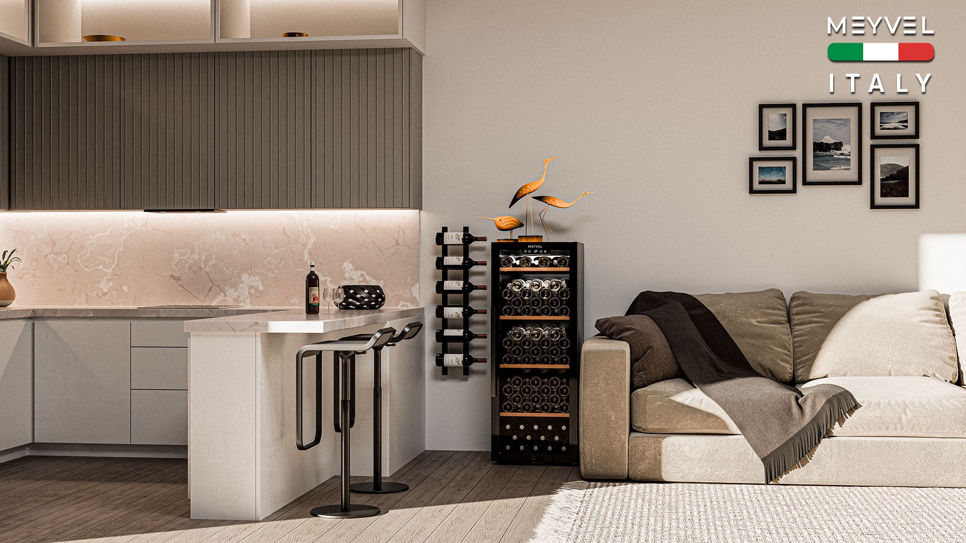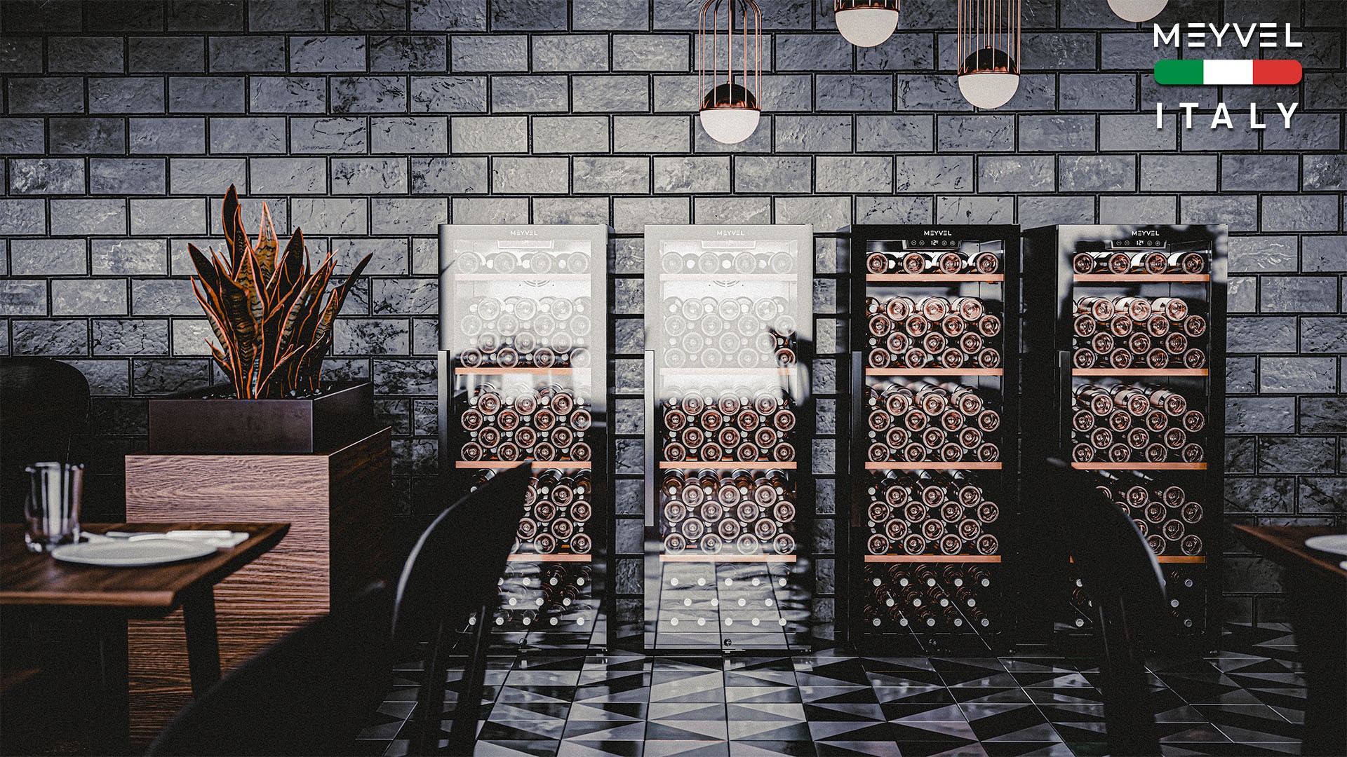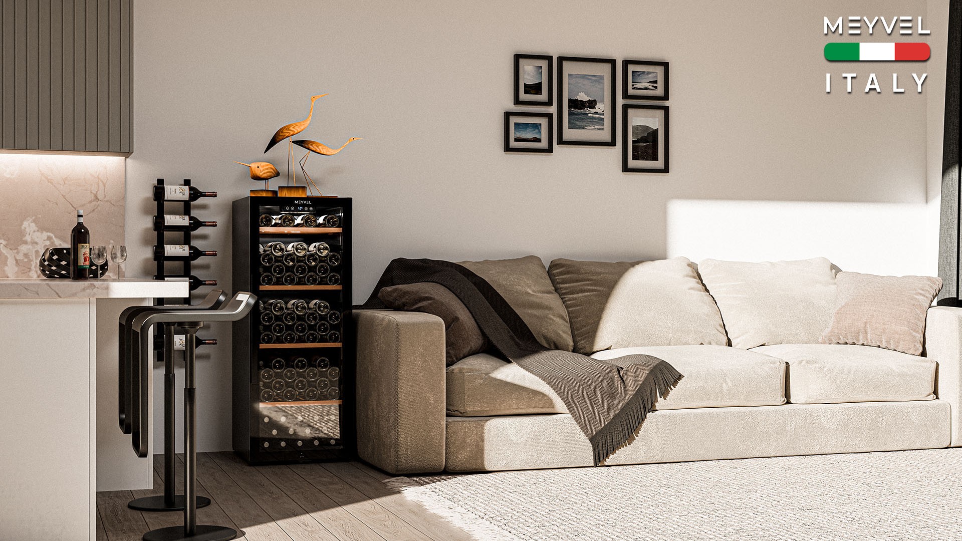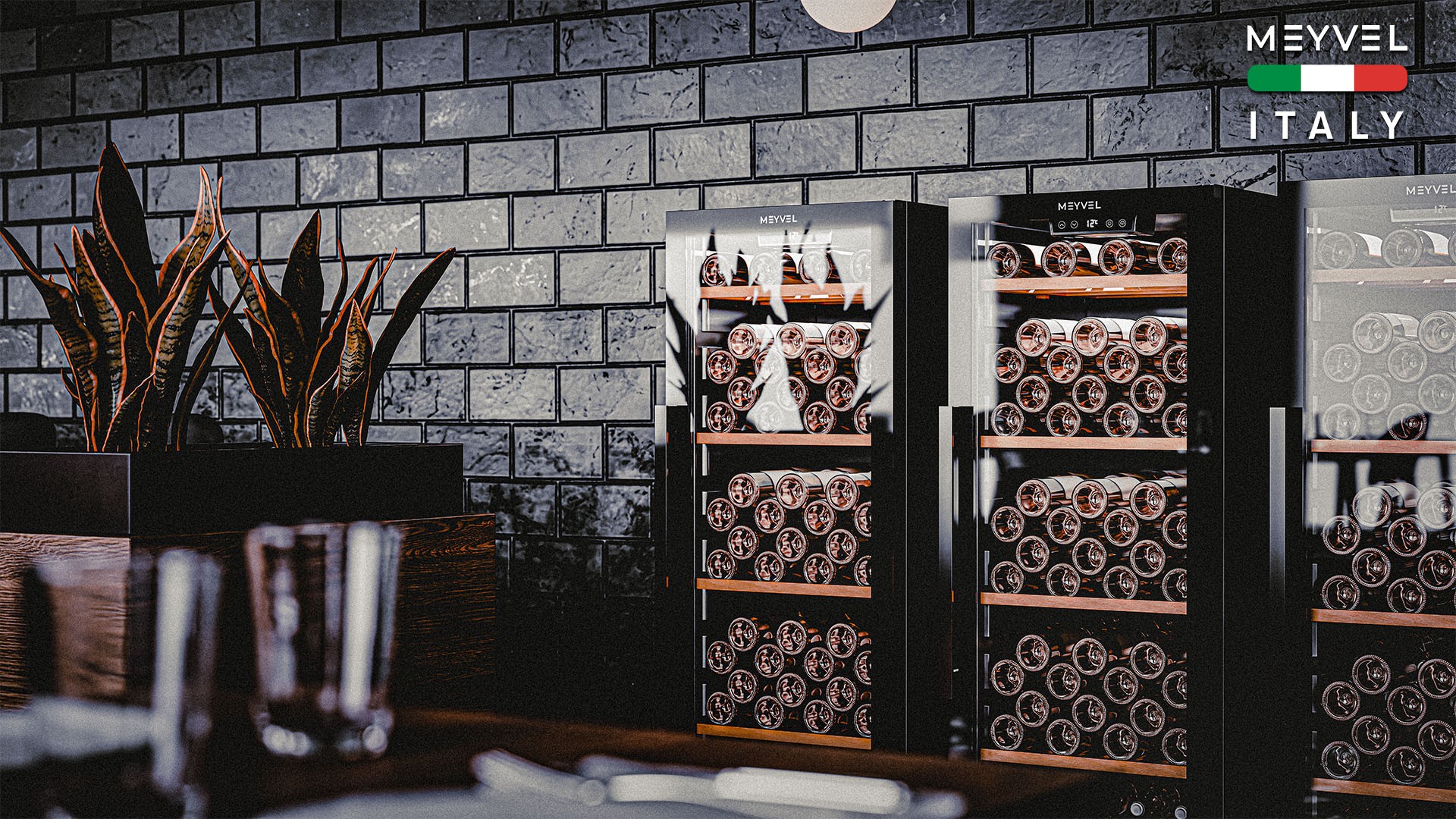 Meyvel MV105-KBF1 — отдельностоящее устройство, поэтому можно разместить его в любом удобном месте ресторана, отеля, бара или домашней винной комнаты без встраивания в мебель. Это удобно не только для создания стиля и атмосферы в интерьере, но и для предоставления легкого доступа к винам.