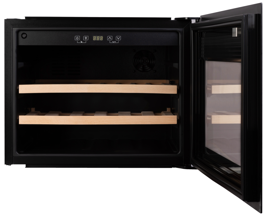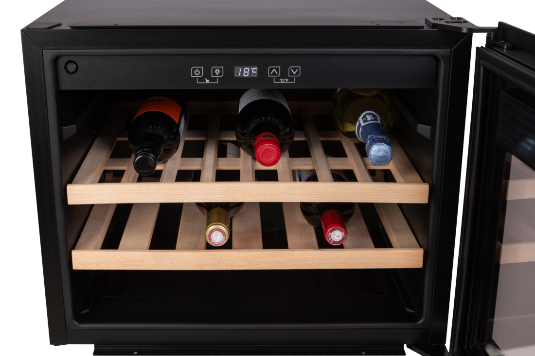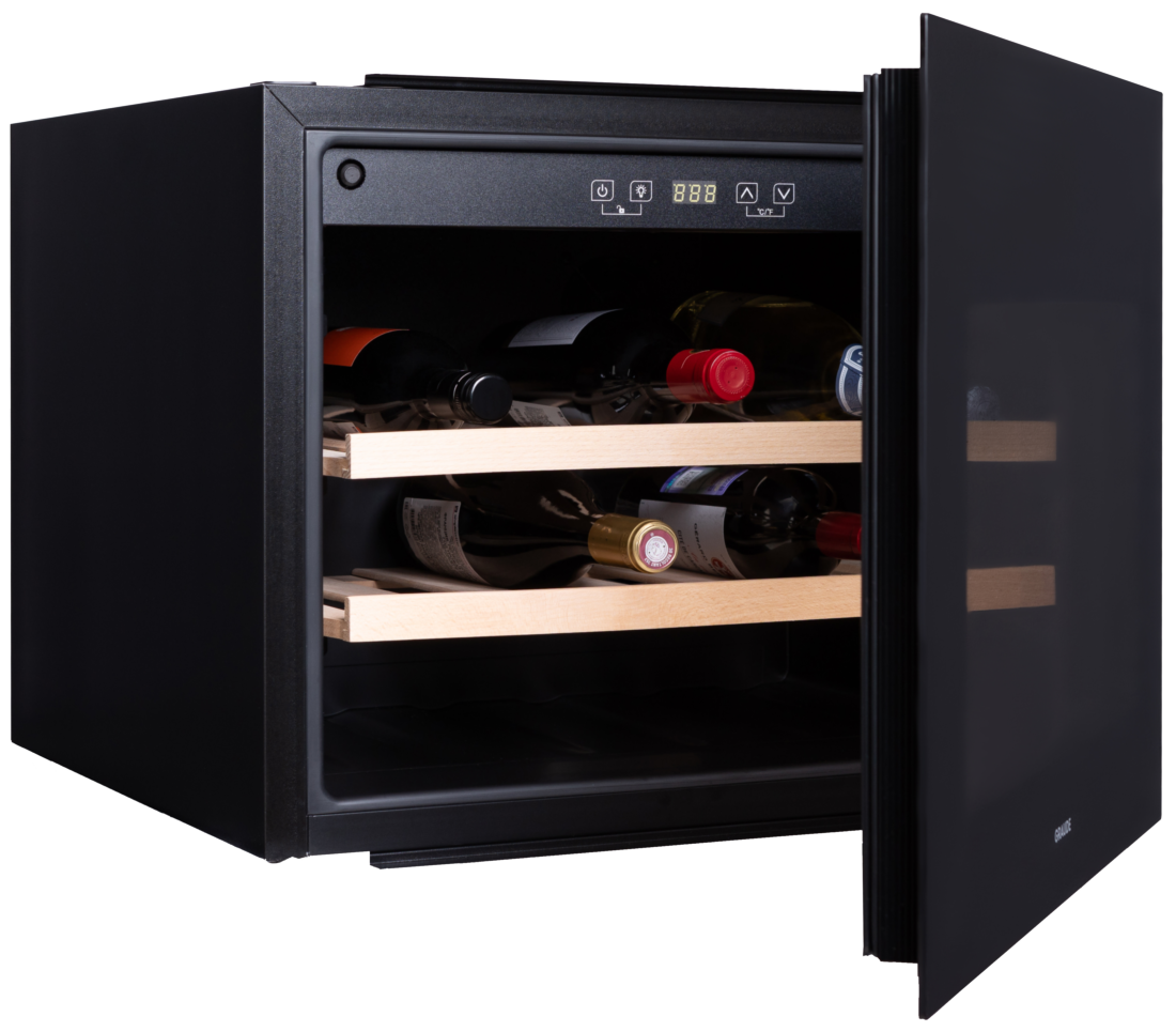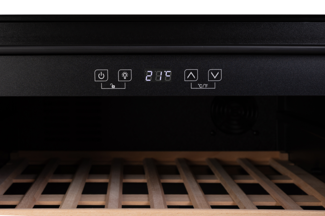 Особенности модели электронная система контроля температуры с сенсорными кнопками, открытие дверцы пуш-кнопкой, 2 съемные выдвижные полки из дерева (бук), электронная индикация температуры, стеклянная дверь с УФ-фильтром